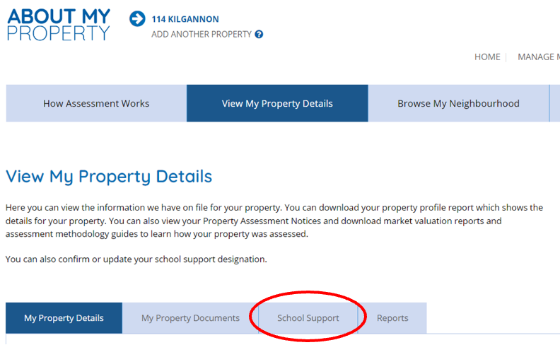 Once you are on the “View My Property Details” page you will need to click on the “School Support” tab/link.