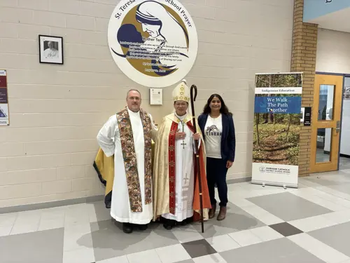 His Excellency, Bishop Vincent Nguyen, together with St. Bernadette parish priest, Father Chris, visited St. Teresa of Calcutta Catholic School on Friday, November 28. Bishop Nguyen led the school in a beautiful Jubilee Year liturgy and explained the significance of the pastoral staff, noting how a shepherd uses it to rescue a sheep trapped in a trench. He reminded everyone that Jesus is the Good Shepherd, that God loves each of us deeply, and invited the school community to bring hope to everyone we meet. He also highlighted the importance of being peacemakers and learning from our mistakes.
