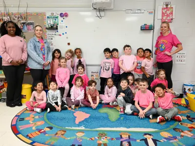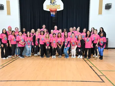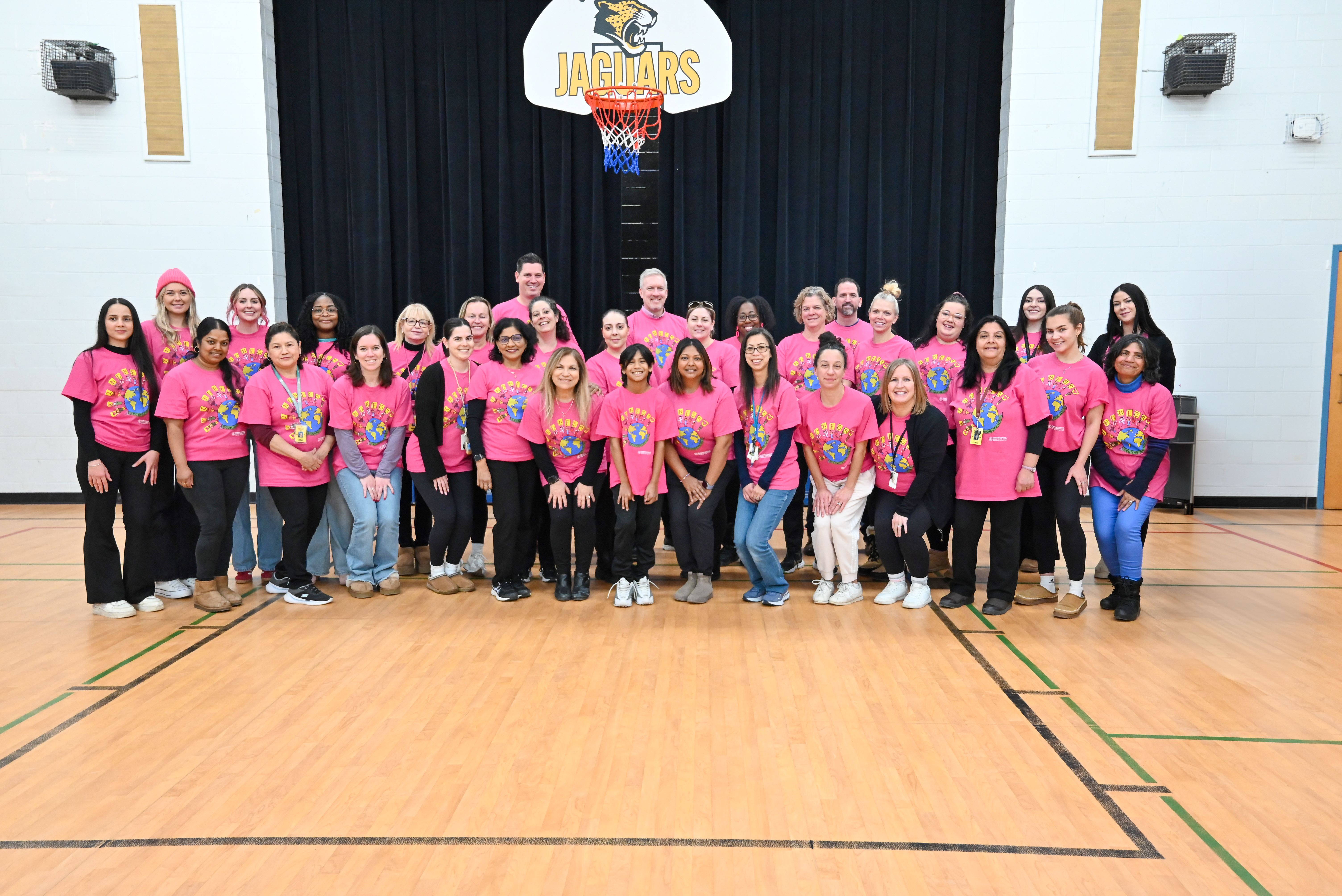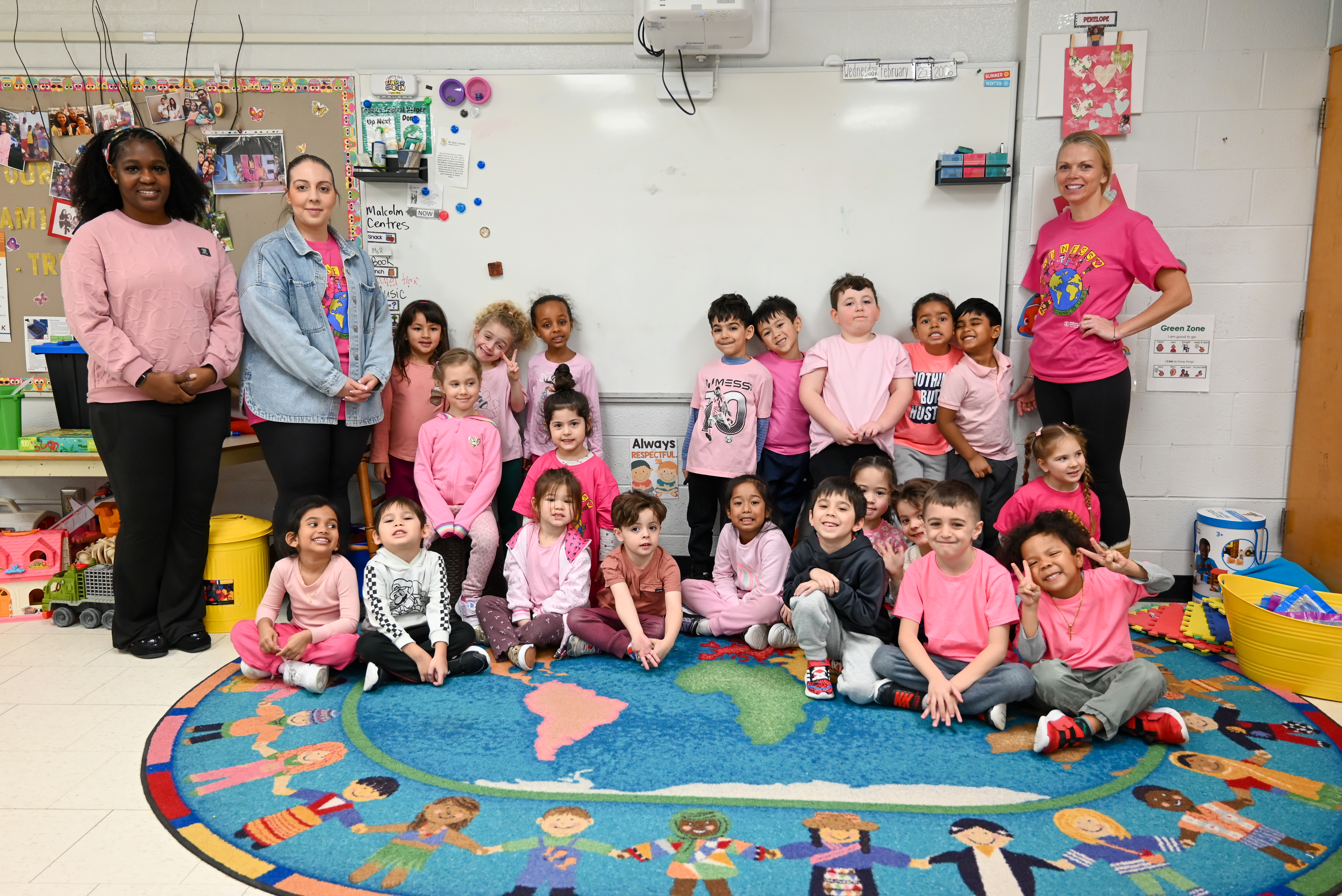 Also pictured: students and staff at St. Isaac Jogues C.S. showing off their pink shirts