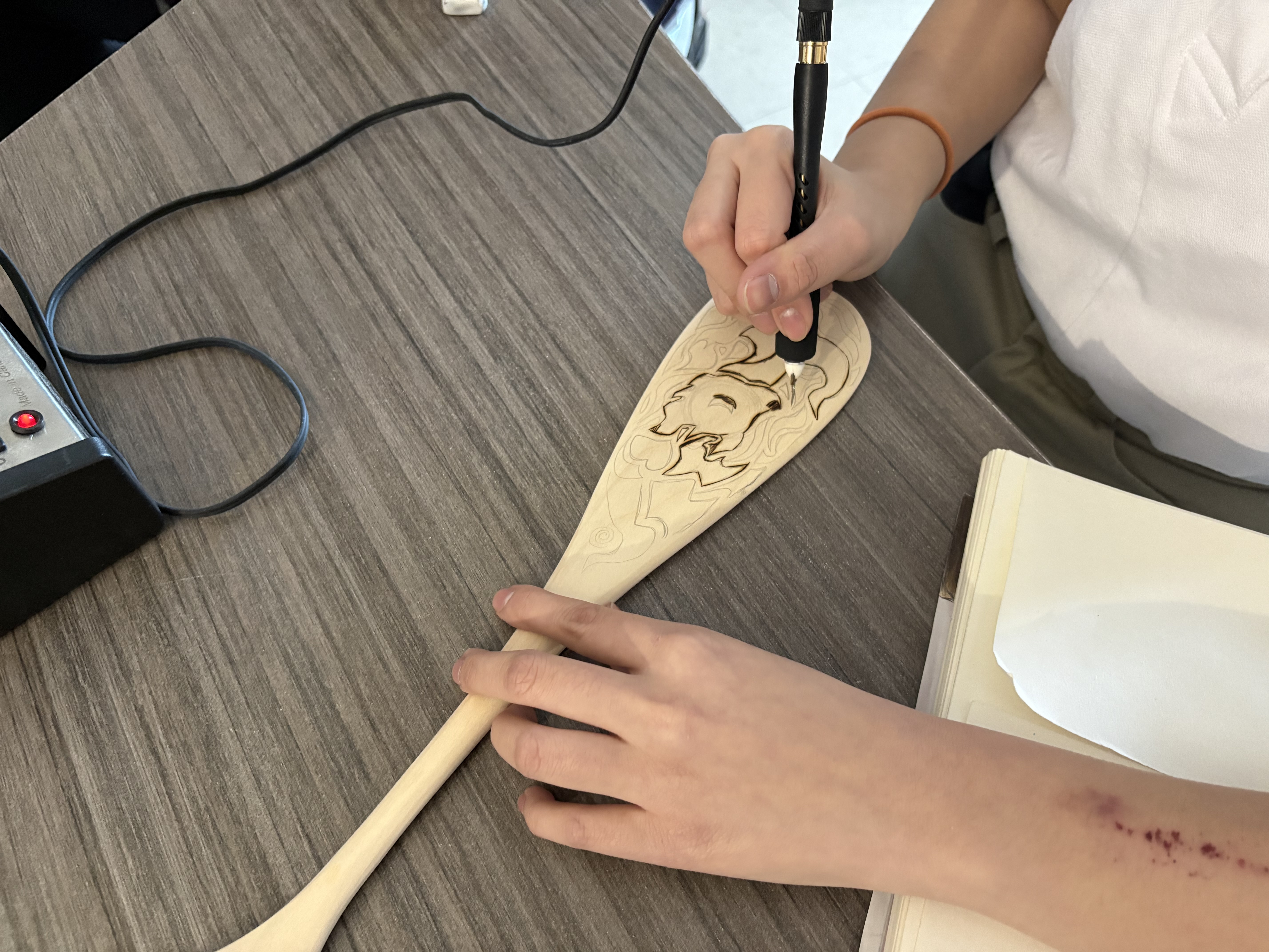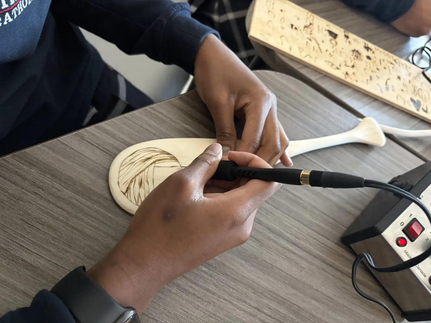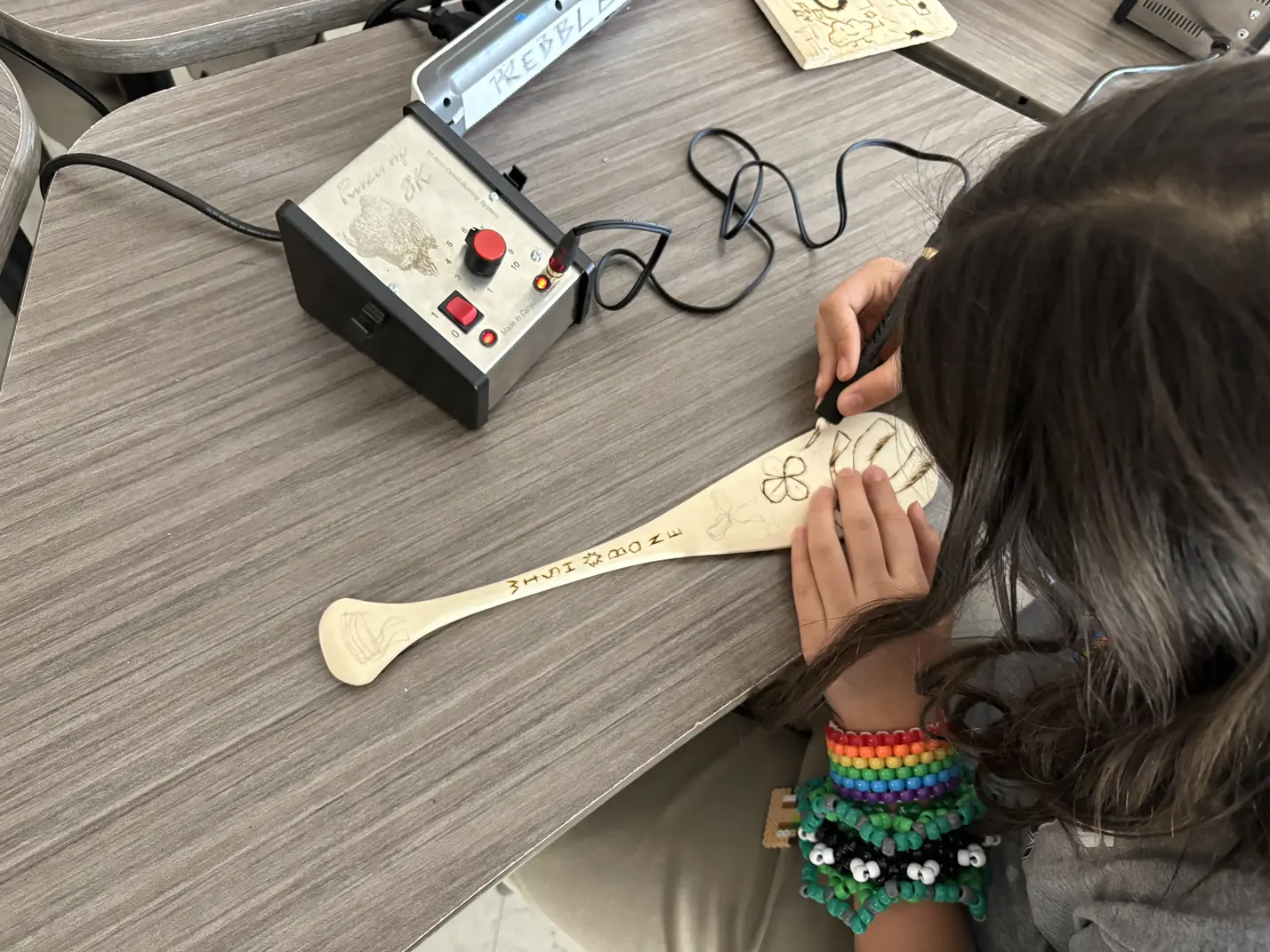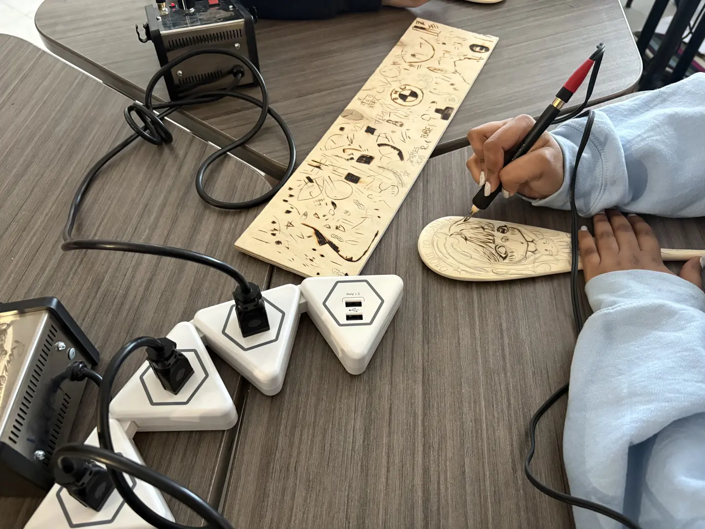 During her visit, students learned foundational wood‑burning techniques and created their own designs under Vicky’s guidance. She shared stories from her life, her cultural teachings, and her evolving art practice, sparking meaningful conversations about identity, community, and the role of art in carrying teachings forward.