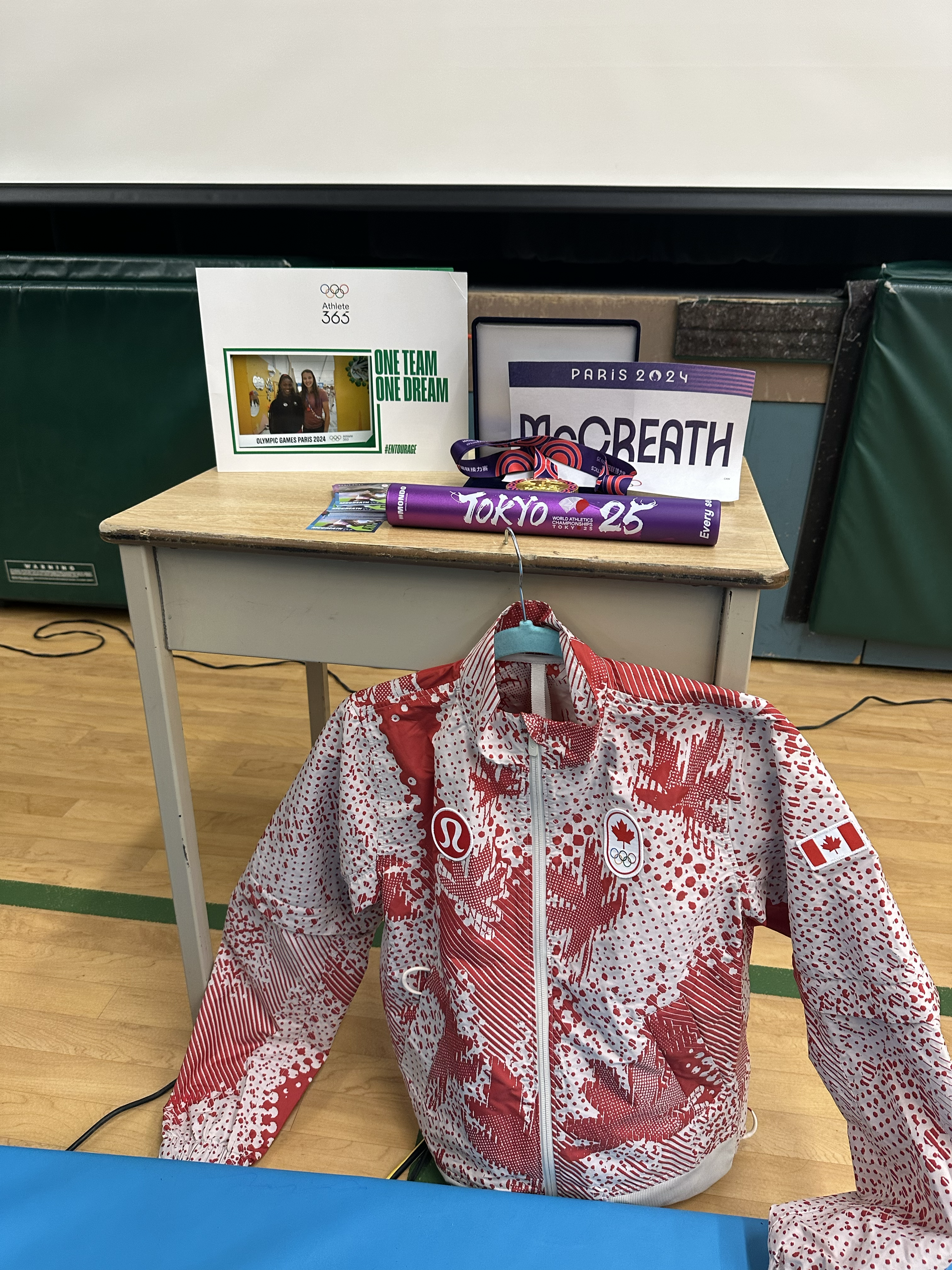 After answering questions from students, Sadé passed around memorabilia, including her gold medal from the 2025 World Athletics Relays, baton, and Team Canada Olympic jacket.